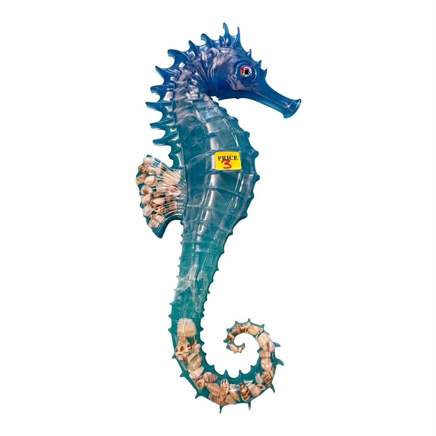 Bring the beauty of the ocean into your space with this stunning handcrafted seahorse from Rhonda’s Redwood Resin Co. Featuring layered ocean blues and crystal-clear resin, this elegant piece captures a flowing, lifelike design. Real shells are beautifully embedded along the fin and curled tail, adding authentic coastal charm and texture.